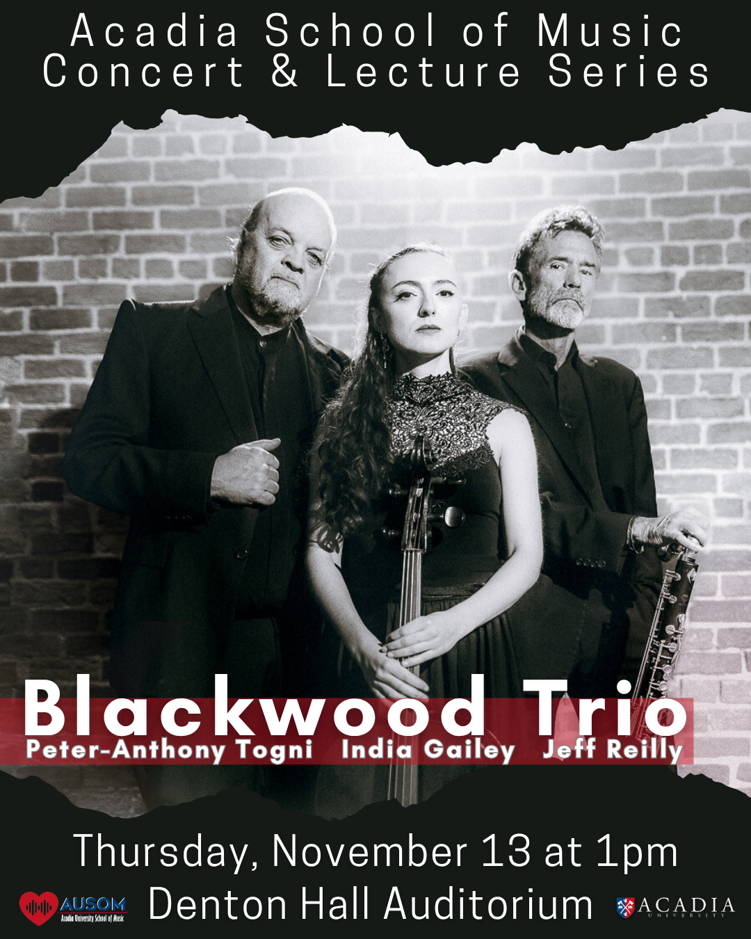 On Thursday, November 13, the Acadia School of Music Concert & Lecture Series presents a performance by Blackwood Trio: Jeff Reilly, Peter-Anthony Togni, and India Gailey.