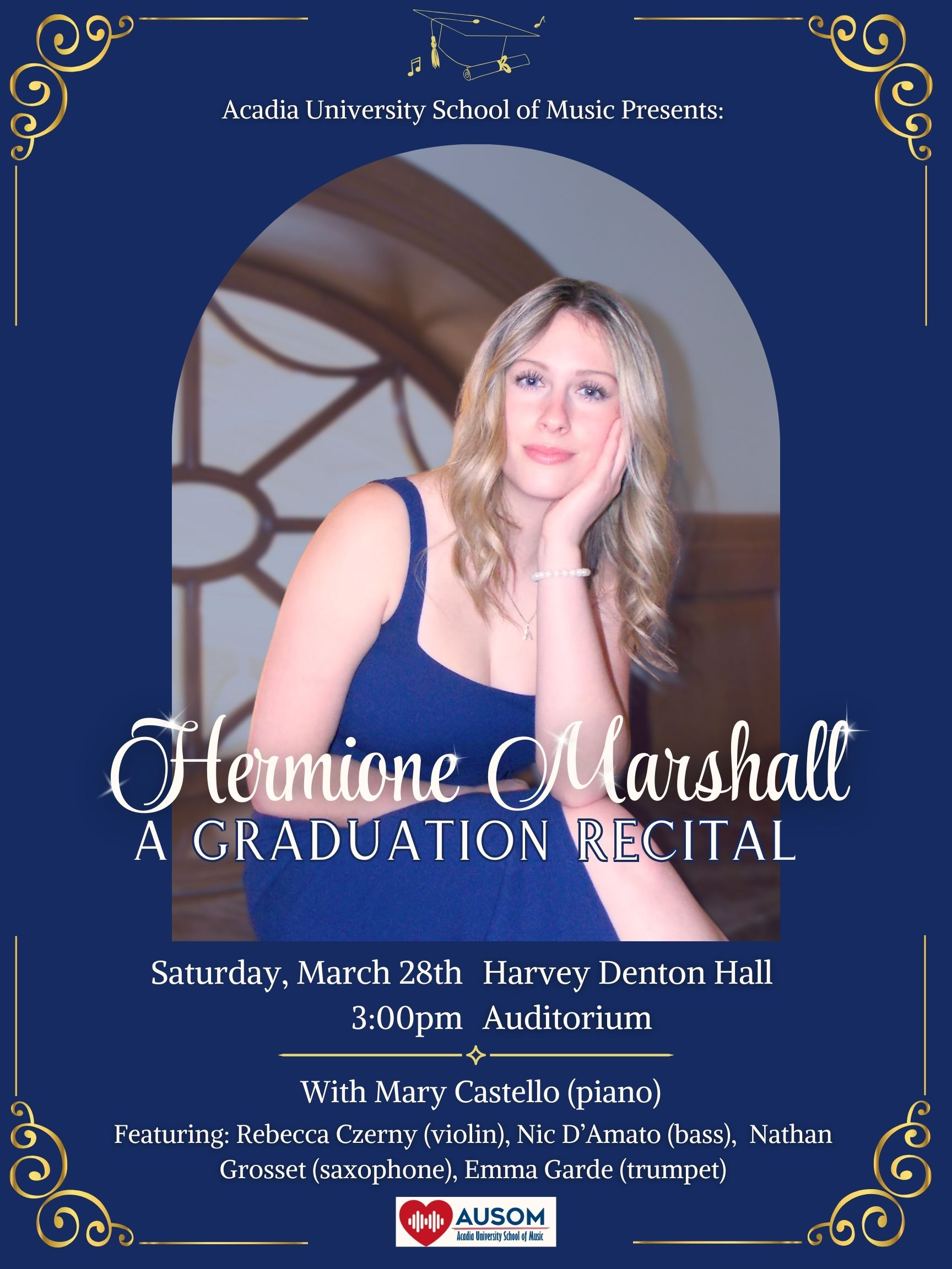 On Saturday, March 28, 2026, Acadia University School of Music presents a 60-minute recital. The program will feature Hermione Marshall (voice) accompanied by AUSOM collaborative pianist, Mary Castello, Rebecca Czerny (violin), Nic D'Amato (bass), Nathan Grosset (saxophone) and Emma Garde (trumpet). This event will take place in Harvey Denton Hall Auditorium at 3:00pm and is free for all to attend, so please join us in supporting our AUSOM student performers!