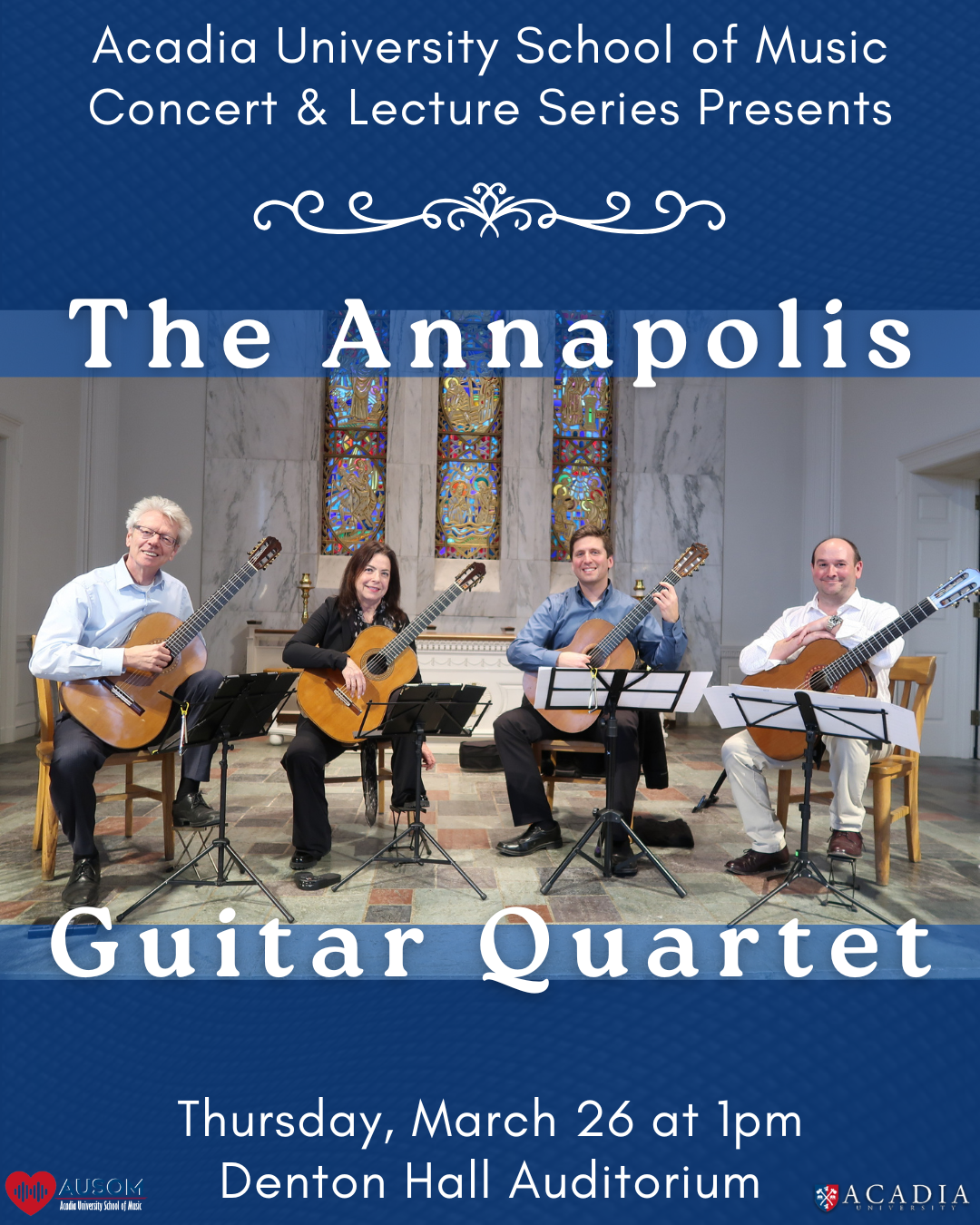 On Thursday, March 26, the Acadia School of Music's Concert & Lecture Series presents a performance by the Annapolis Guitar Quartet. AUSOM faculty member Eugene Cormier with fellow guitarists Dale Kavanagh, Thomas Kirchhoff, and Matthew Martin will play works by Kavanagh, Domeniconi, Jenkins and more This presentation will begin at 1:00pm in DENTON HALL. Concert & Lecture Series events are free and all are welcome to attend – please join us! |