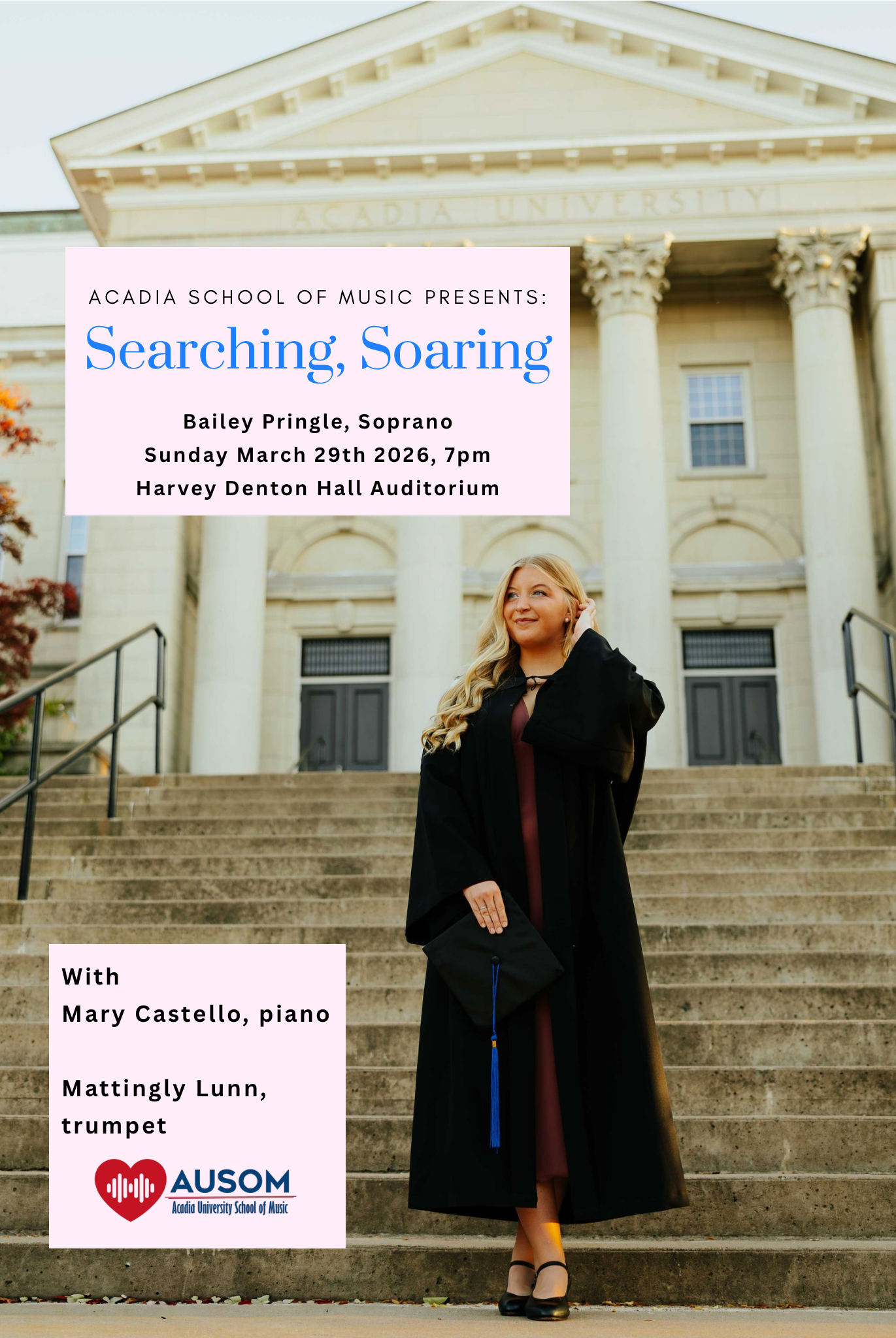 | On Sunday, March 29, 2026, Acadia University School of Music presents, "Searching, Soaring". A 60-minute Graduation recital. The program will feature Bailey Pringle (voice) accompanied by AUSOM collaborative pianist, and Mattingly Lunn (trumpet). This event will take place in Harvey Denton Hall Auditorium at 7:00pm and is free for all to attend, so please join us in supporting our AUSOM student performers! |