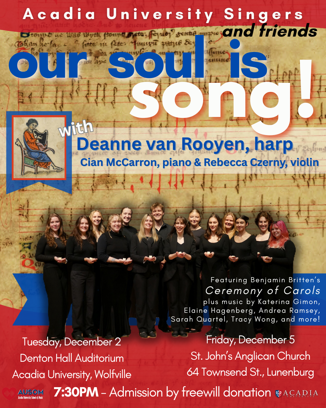Need an uplifting boost to kickstart your holiday mood? Yearning to find solace immersed in the beauty of poignant poetry merged with song? Or, longing to make your spirit soar with joyful, feel-good music? Whatever you're seeking, come as you are and find your heart's content in “Our Soul Is Song" - a concert by the Acadia University Singers.