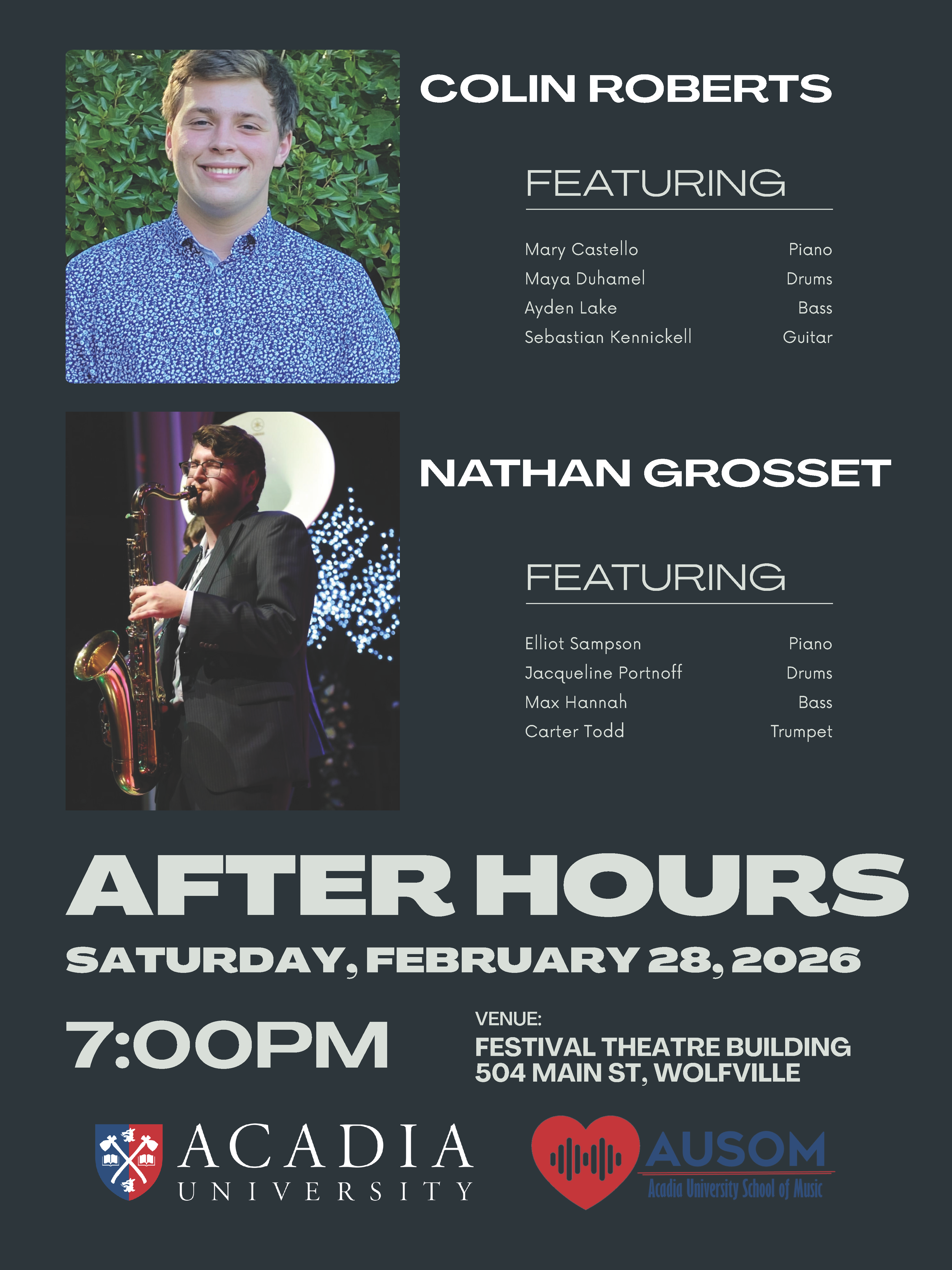 On Saturday, February 28, 2026, Acadia University School of Music presents "After Hours". Two half-hour saxophone recitals, one by Colin Roberts (featuring Sebastian Kennickell on guitar, Maya Duhamel on drums, Ayden Lake on bass, and Mary Castello on piano), and another by Nathan Grosset (featuring Elliot Sampson on piano, Jacqueline Portnoff on drums, Max Hannah on bass, and Carter Todd on trumpet).